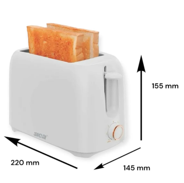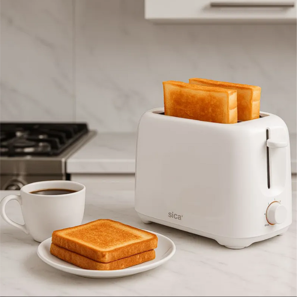 Tostadora eléctrica para pan (tipo lactal). Cuenta con perilla para regular el nivel de tostado o cancelar, y palanca para cargar y extraer el pan. Incorpora bandeja recolectora de migas para una limpieza sencilla.